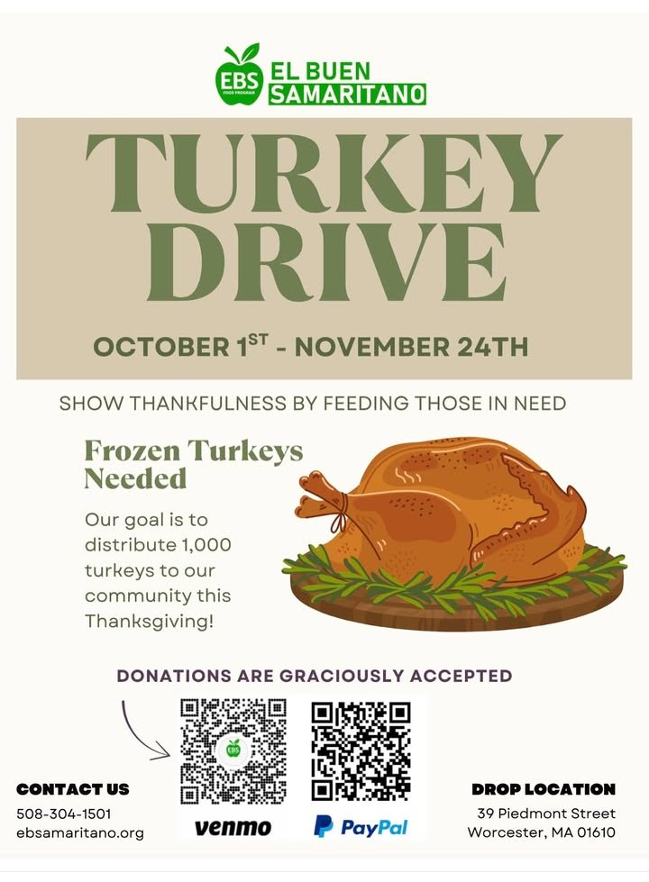 EBS Turkey Drive Oct 1 to Nov 24. Show thankfulness by feeding those in need. Frozen Turkeys Needed. Our goal is to distribute 1,000 turkeys to community members. Donations accepted via Venmo and PayPal. Contact EBS via phone 508-304-1501 website ebsamaritano.org. Drop location: 39 Piedmont St. Worcester, MA